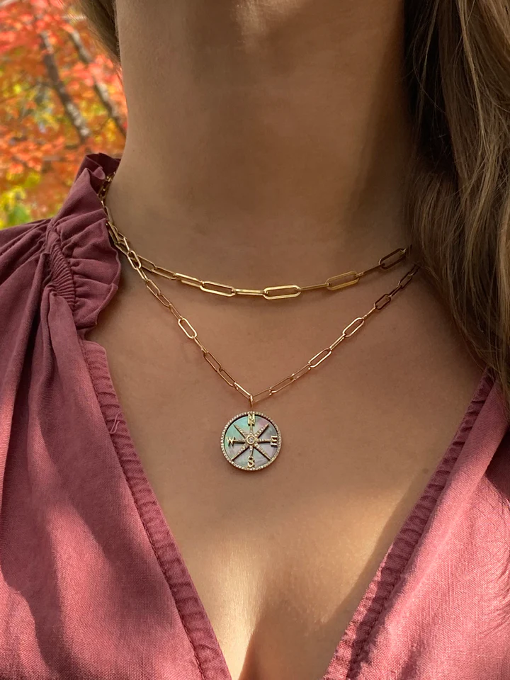 The Diamond and Mother of Pearl Compass Charm is a symbol of guidance, adventure, and timeless elegance. Crafted from solid 14K gold, this exquisite 3/4″ charm features a beautifully designed compass motif, accented with 97 sparkling diamonds (0.24 ct) for a brilliant touch. At its center lies a stunning mother of pearl (2.81 ct), radiating a soft, iridescent glow that adds depth and sophistication.