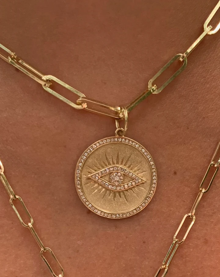 The Diamond Evil Eye Protection Talisman is a powerful symbol of protection, designed to ward off negative energy while adding a touch of elegance to your jewelry collection. Crafted from solid 14K gold, this stunning talisman features a beautifully detailed evil eye design, adorned with dazzling diamonds that enhance its brilliance. With a 7/8″ diameter, it is the perfect size for a statement piece, whether worn on a chain as a pendant or added to a charm bracelet.