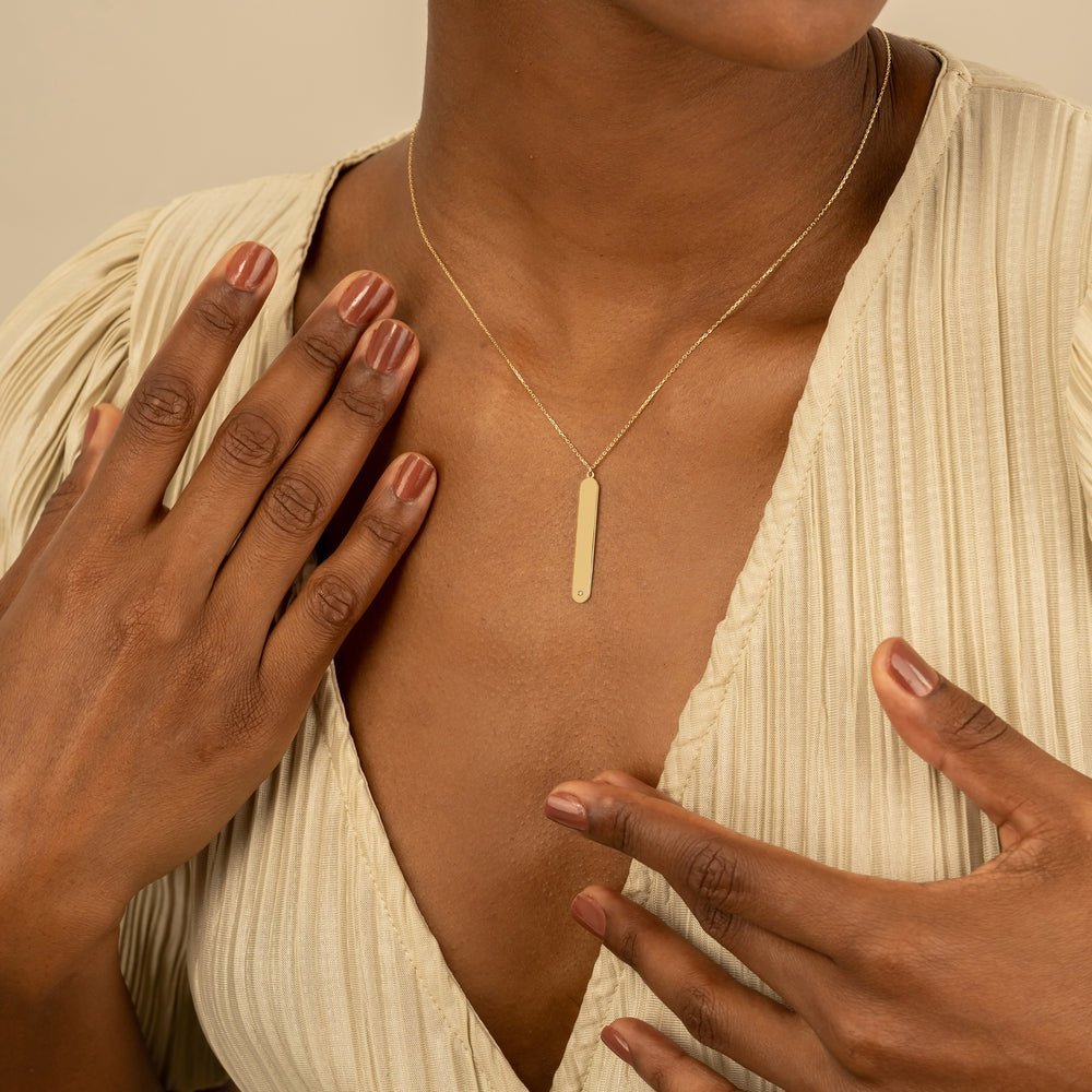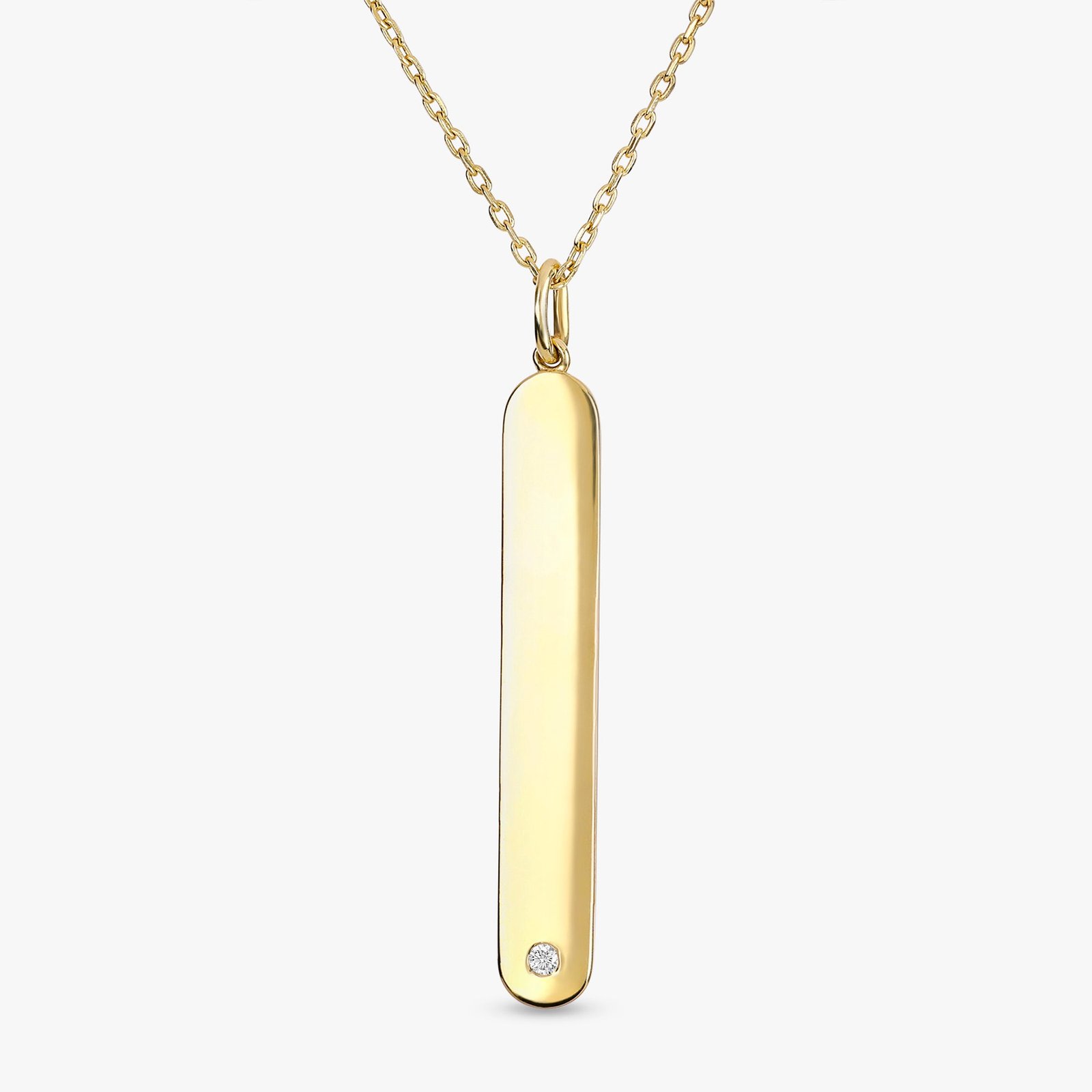 Elevate your style with our Diamond Vertical Tag Necklace, featuring a delicate solid gold bar adorned with a sparkling diamond. Customize it with meaningful engravings for a truly personal touch.