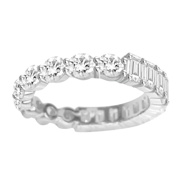 Available in white, rose, and yellow gold, this timeless ring features a substantial 3.39 carats of natural diamonds, making it an exquisite choice for those who appreciate bold elegance. The alternating pattern of emerald and round brilliant cuts adds depth, dimension, and visual intrigue, while enhancing the sparkle from every angle. Each diamond is meticulously selected for its GH Color and VS-SI Clarity, ensuring the highest standards of brilliance and craftsmanship.