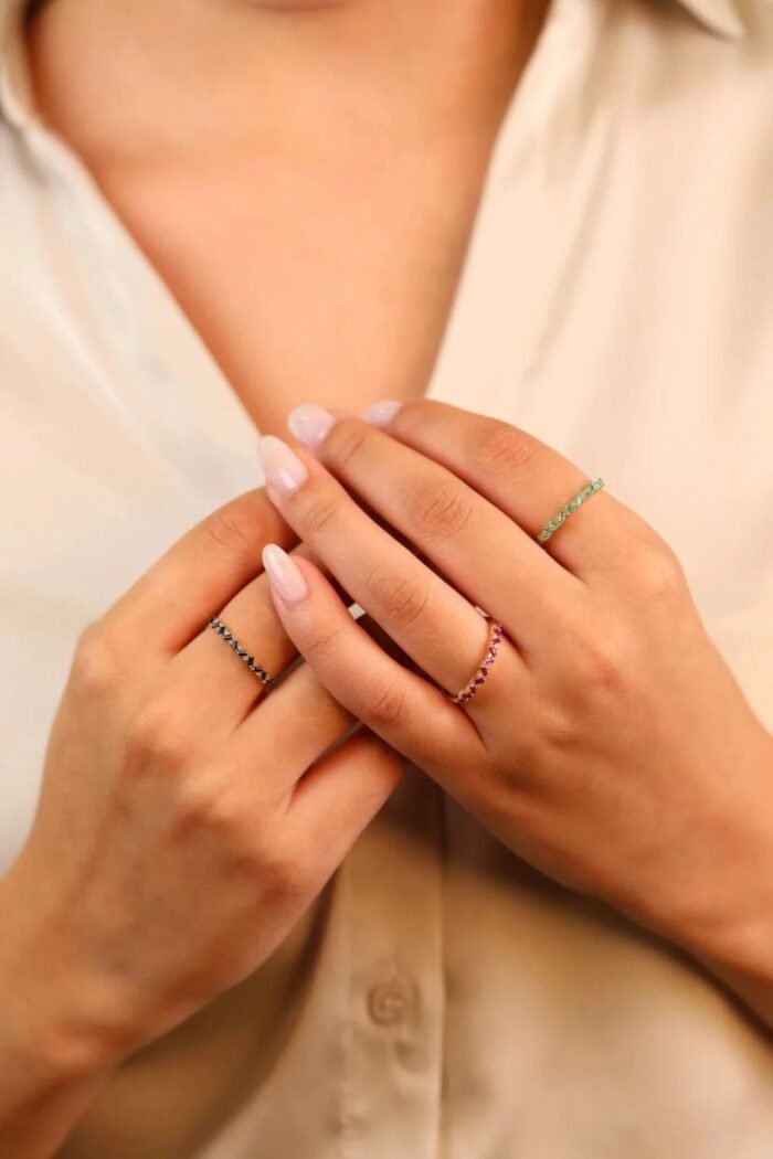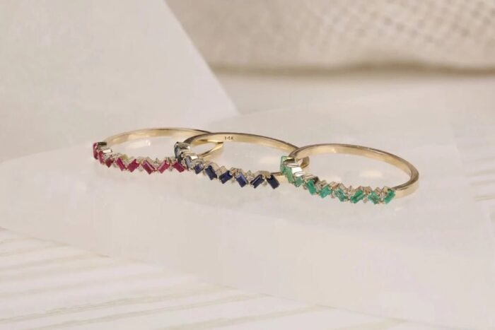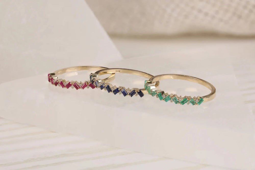 Elegant 14K solid gold eternity ring featuring sparkling diamonds and baguette-cut rubies, perfect for timeless sophistication and everyday luxury.