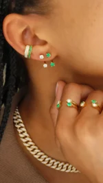 Elegant 14K solid gold emerald orbit earrings, featuring vibrant emeralds set in a sleek, modern orbit design for a chic and sophisticated look.