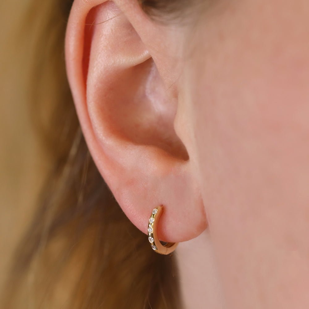 The flush set diamonds on these huggies are subtle yet elegant. I love wearing them for everyday sparkle.