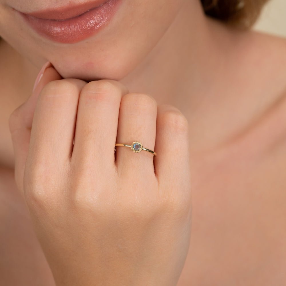 Complementing the labradorite centerpiece is the solid gold band, with a thickness of 1.4 mm, adding a touch of sophistication and refinement to the overall design. The clean lines and minimalist aesthetic of the band harmonize perfectly with the Art Deco-inspired bezel setting, creating a harmonious blend of vintage charm and contemporary allure.