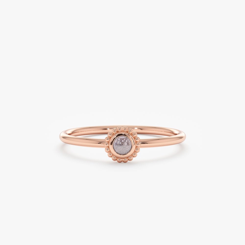 At the heart of the ring lies a mesmerizing labradorite gemstone, renowned for its iridescent play of colors that dance and shift with the light. From ethereal greens to tranquil blues and mysterious grays, the labradorite’s hues evoke a sense of wonder and enchantment, symbolizing the transformative power of nature and the healing energy it embodies.