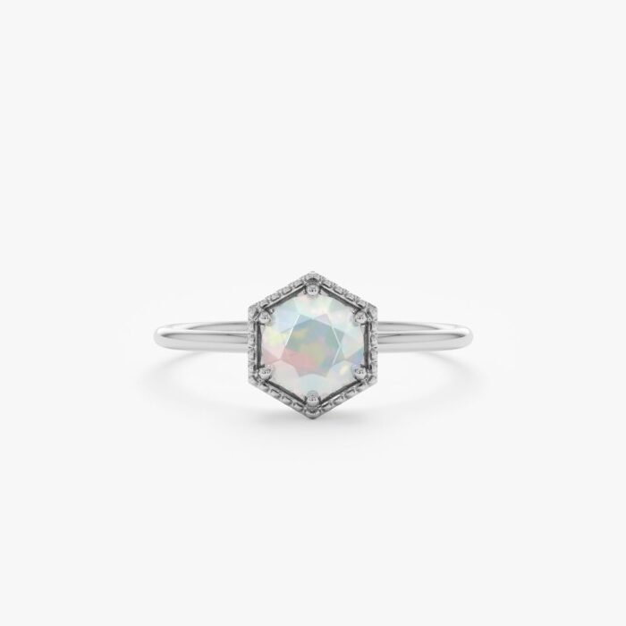 The hexagon shape of the Opal gemstone adds a modern twist to its timeless appeal, symbolizing harmony, balance, and creativity. Available in a range of sizes, this ring is a versatile addition to any jewelry collection, promising to complement any ensemble with effortless grace and style.