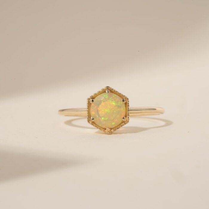 Stunning 14K solid gold ring featuring a hexagon-shaped opal, showcasing vibrant play-of-color for a unique and elegant look.