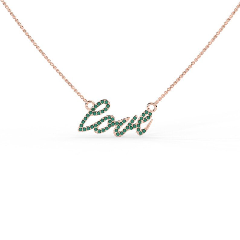 A romantic 14K solid gold necklace featuring the word “Love” with a natural emerald, offering a meaningful and elegant design perfect for any occasion.