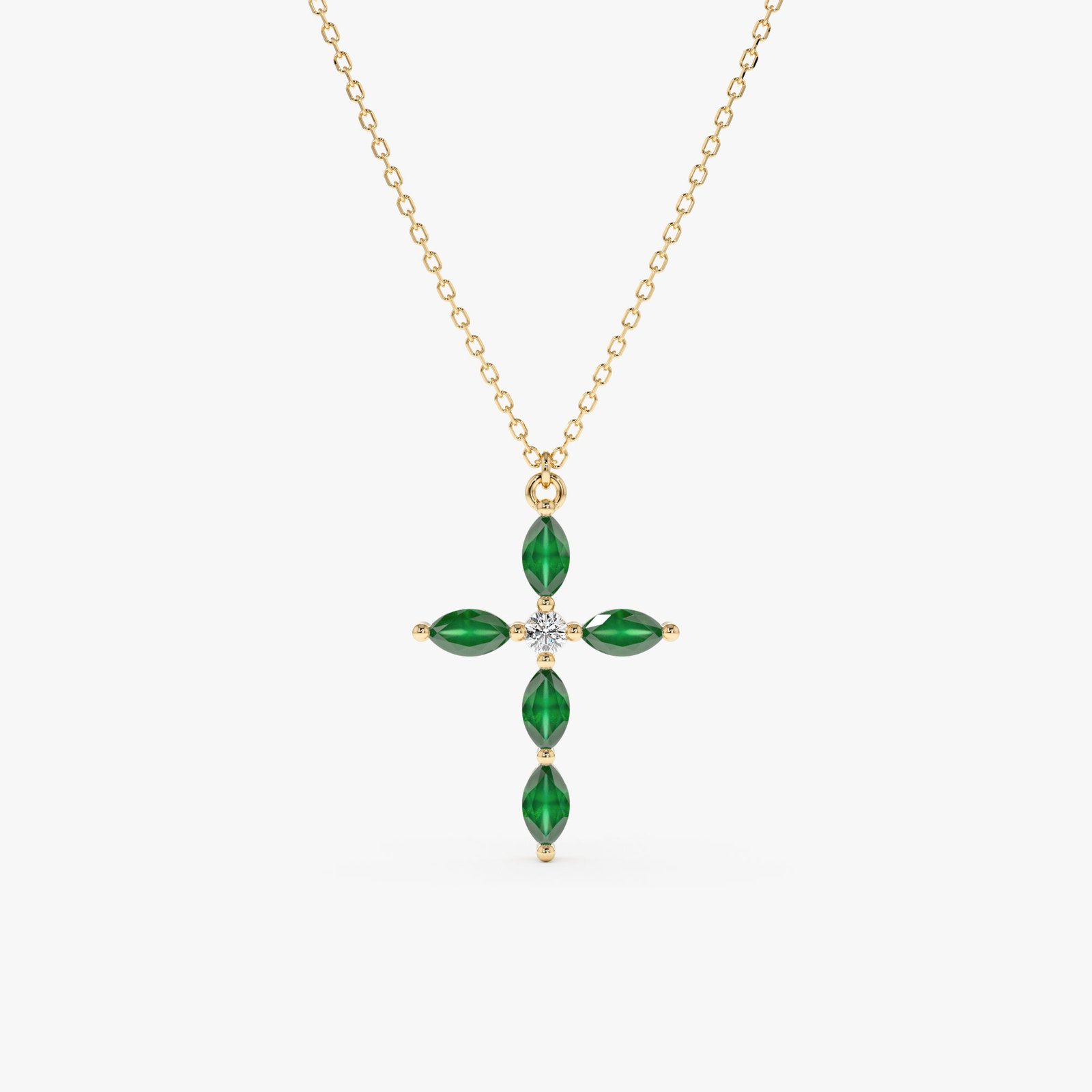 Discover the timeless elegance of our Marquise Emerald Cross Necklace. Crafted from solid gold, this antique-inspired piece features a cross pendant adorned with marquise-cut emeralds, accented by a sparkling diamond at its center.