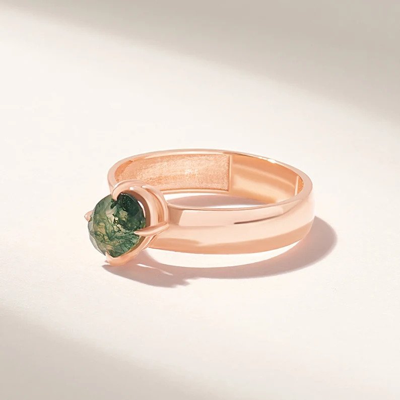 A unique 14K solid gold solitaire ring featuring a stunning moss agate, offering a natural and elegant touch to any jewelry collection.