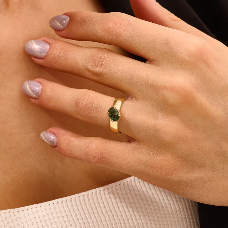Made from 14K solid gold, the band is available in white, rose, or yellow gold, which contrasts with the deep green of the agate, creating a stunning contrast.