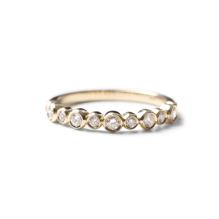 The Naomi Bezel Natural Diamond Stacking Ring in 14K gold features 11 bezel-set Natural diamonds (0.27 ct) for a delicate sparkle. Weighing 2-2.5 grams, it’s perfect for stacking or wearing solo.