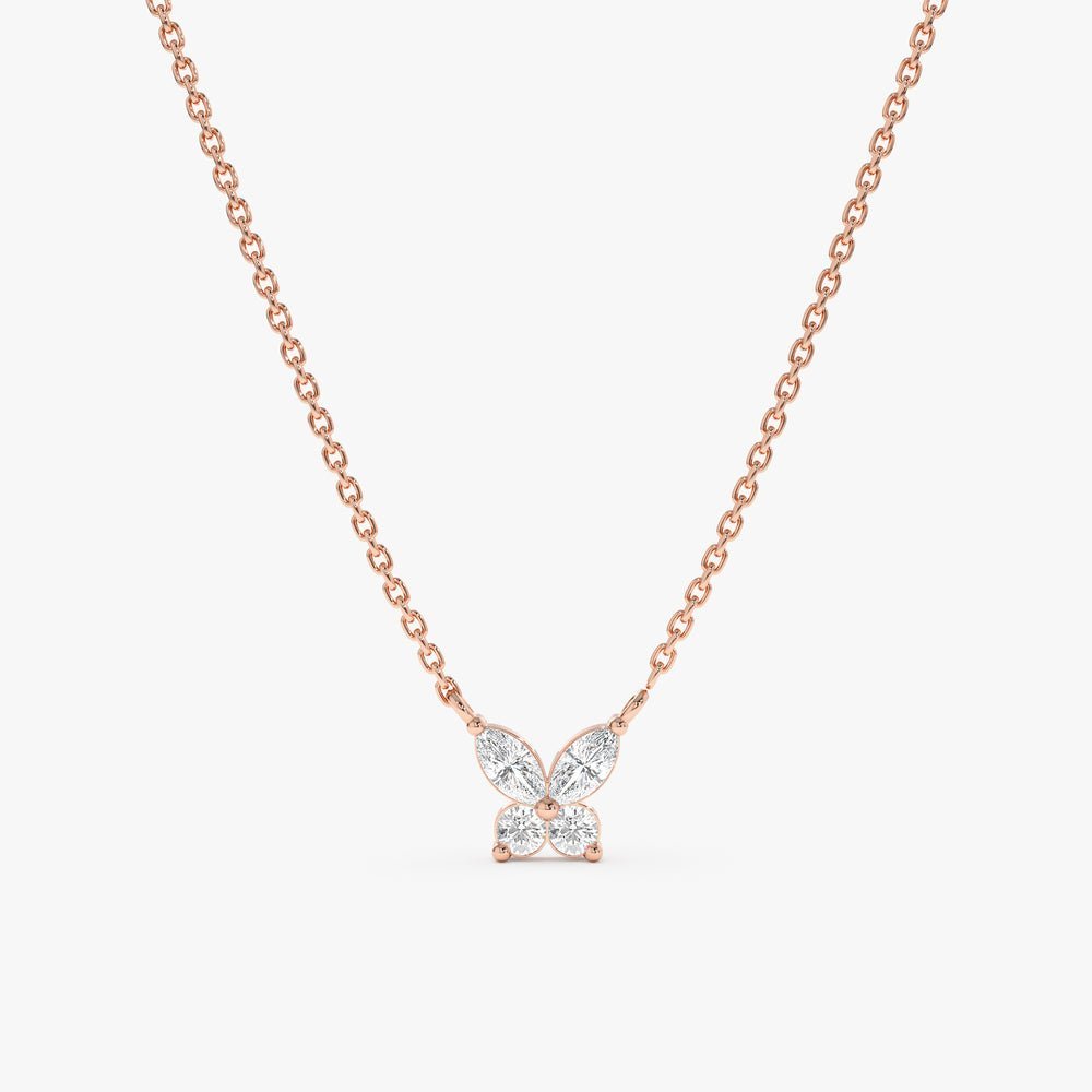 Embrace transformation with our Diamond Butterfly Necklace, featuring a delicate butterfly pendant crafted from solid 18k gold and adorned with sparkling marquise-cut and round diamonds.