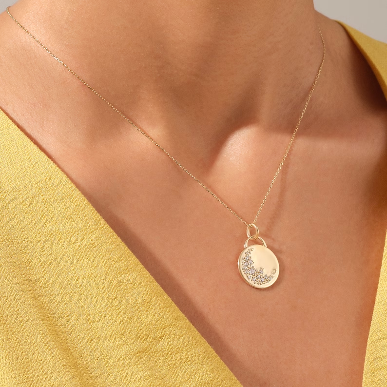 Natural Diamond Crescent Moon Necklace | 18k Solid Gold Disc Necklace for Women