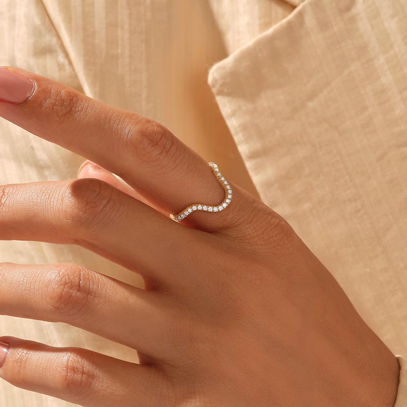 Available in White, Rose, and Yellow Gold, this curved band offers a versatile and stylish option for daily wear or special occasions. Whether worn as a contour band to elevate an engagement ring or as a standalone accent, this piece brings a modern yet timeless touch to any jewelry collection.