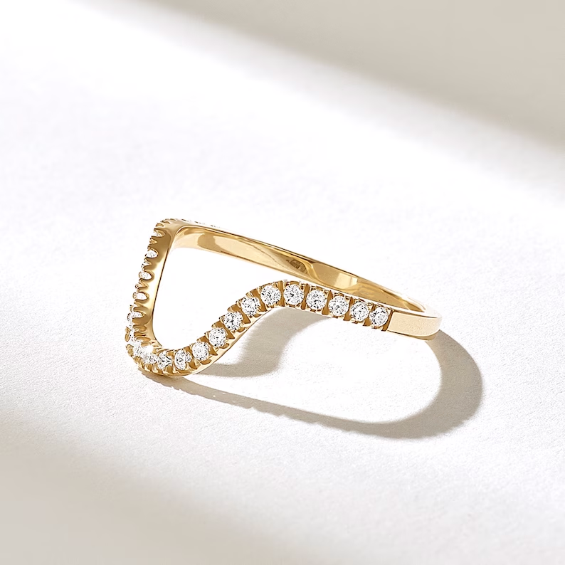 Delicate 14K solid gold curved diamond ring with 0.06ct GH/VS-SI diamonds. Perfect for stacking or as a contoured wedding band.