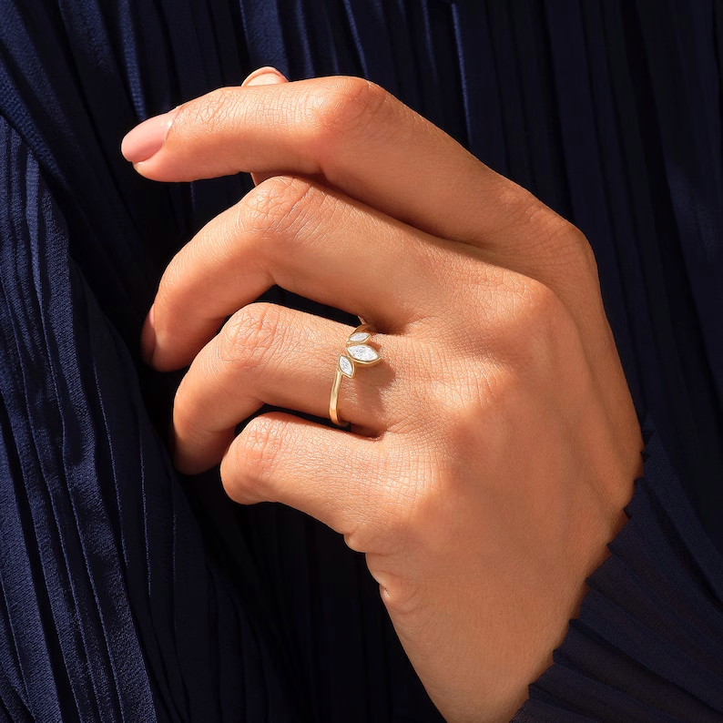 Elegant 14K gold cluster ring with three 4x2 mm natural diamonds (0.39 ctw). G-H color, VS-SI clarity. GIA certified & BIS hallmarked.