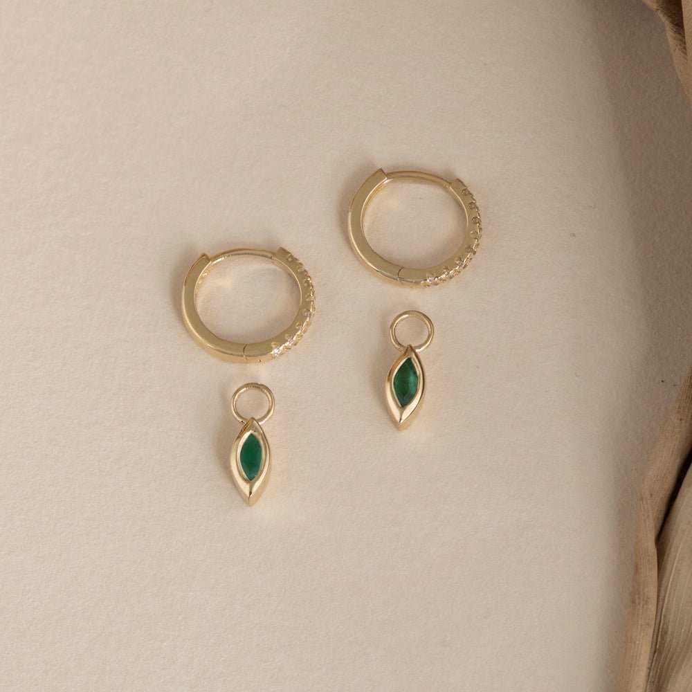 The detachable marquise emerald charm measures 5.6 mm and hangs from a neat 2.5 mm inner diameter bail, making it easy to wear on the included huggies or swap onto your favourites. The huggie hoops feature an 11 mm outer diameter for a close, polished fit that’s ideal for day-to-night wear.