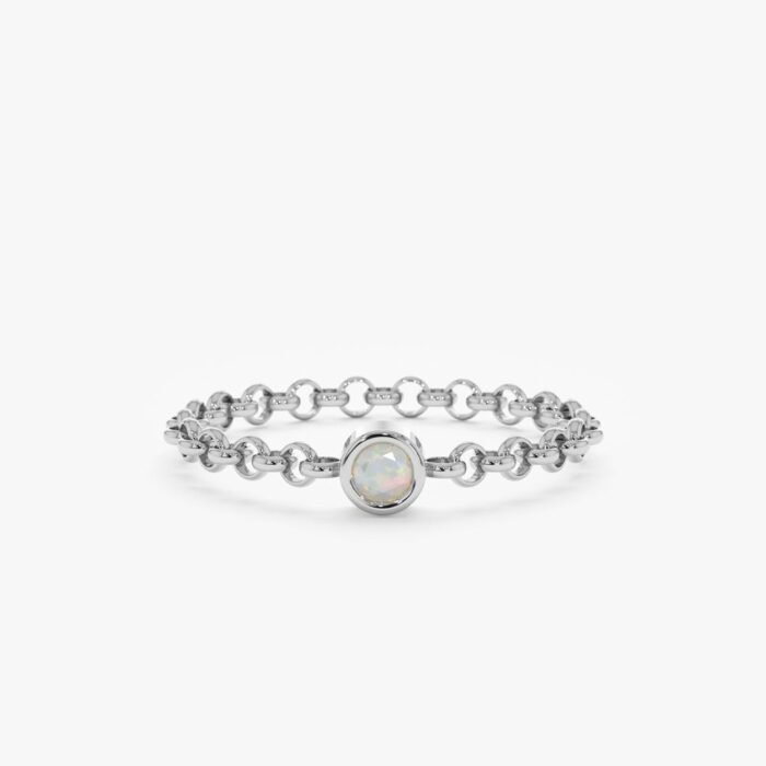 “A delicate 14K solid gold chain ring featuring a vibrant opal, offering a minimalist and elegant design perfect for stacking or everyday wear.