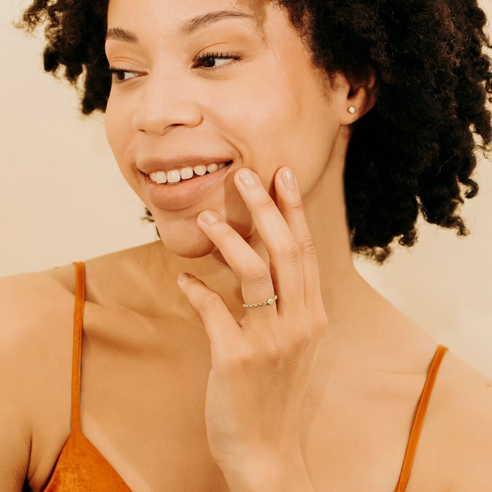 With its modern aesthetic and understated elegance, the Opal Chain Ring is a versatile accessory that can be stacked with other rings on the same finger or paired with different styles on your hand. Its petite size allows for effortless stacking, adding depth and dimension to your jewelry collection.