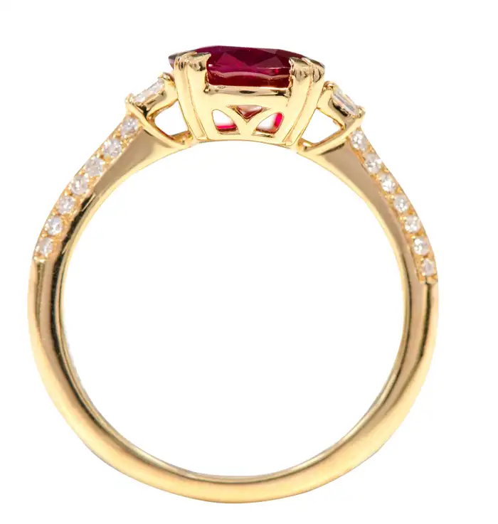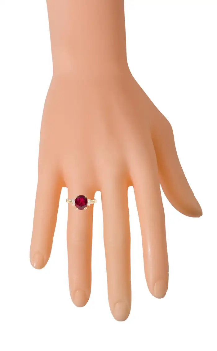 A striking 14K solid gold solitaire ring featuring an oval-cut ruby and diamonds, offering a bold and elegant statement of love and passion.