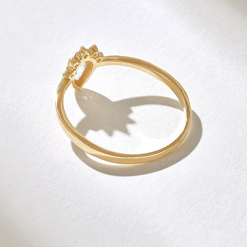 The tiara ring features a pear-shaped moissanite diamond centerpiece, flanked by smaller moissanite diamonds that bring the total carat weight to 0.21 ctw. The diamonds are meticulously selected for their top-tier D color and VVS1 clarity, ensuring exceptional brilliance and clarity that capture the light with every movement.