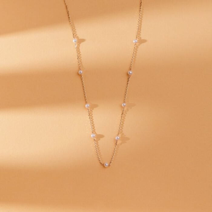 Crafted from solid gold, the delicate chain showcases lustrous natural pearls, each measuring 3 mm in size. The pearls’ natural beauty adds a touch of sophistication to any ensemble, making this necklace perfect for both casual and formal occasions.