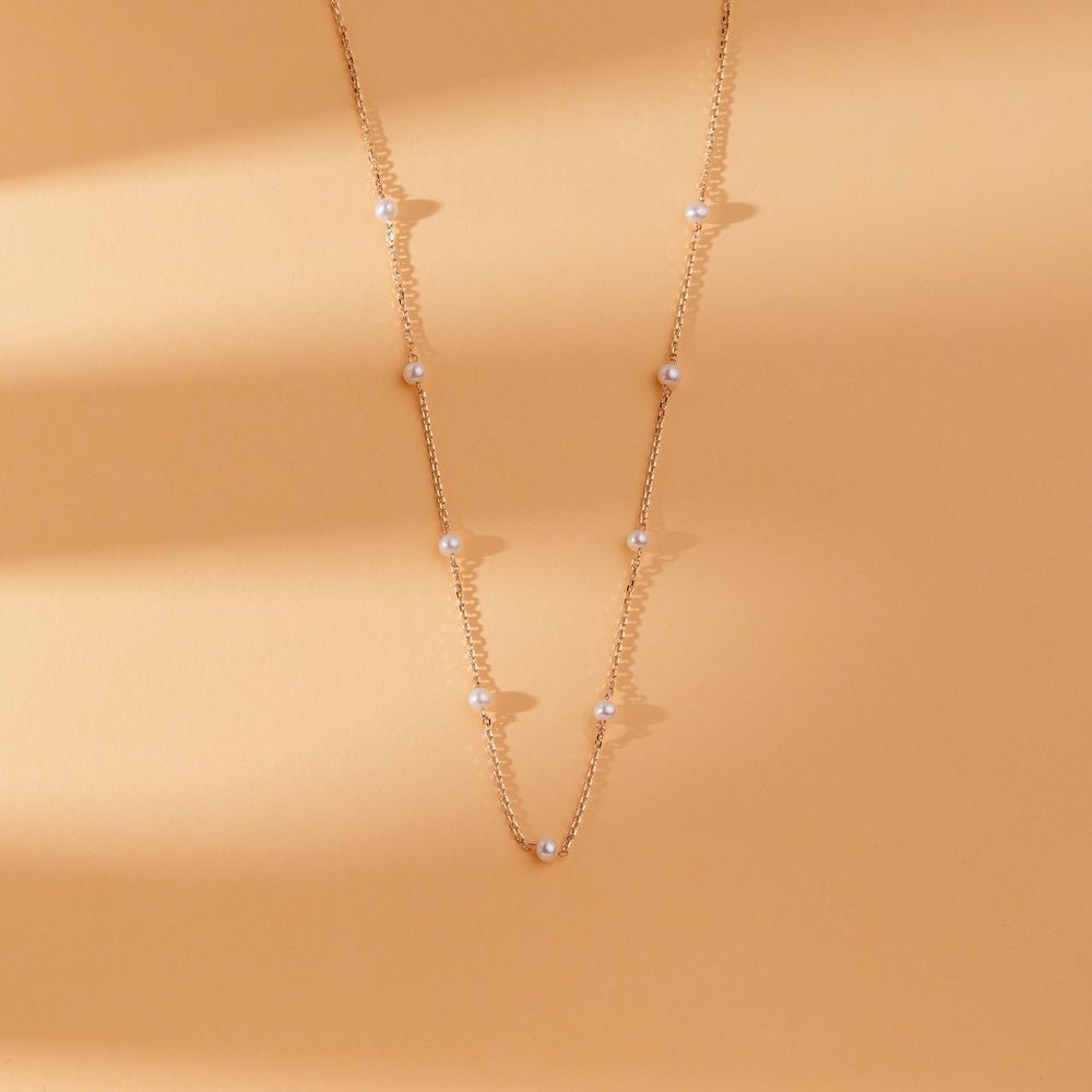 Elevate your style with our Natural Pearl Station Necklace, featuring lustrous pearls on a delicate solid gold chain.