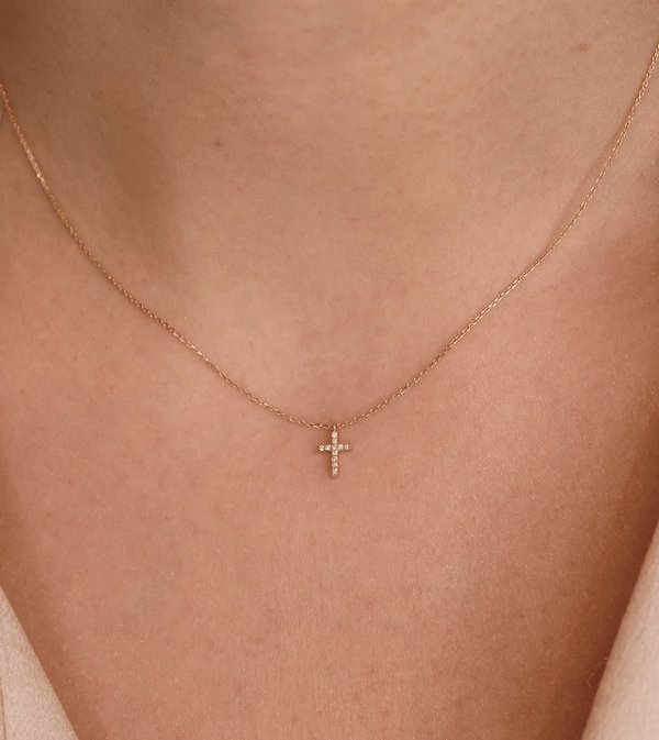 Elevate your faith with our Petite Diamond Cross Necklace, featuring a dainty cross pendant adorned with sparkling diamonds in solid 18k gold.