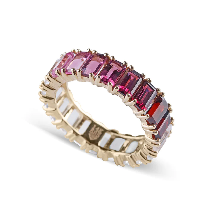 A vibrant 14K solid gold eternity band featuring pink ombre emerald-cut topaz stones, offering a unique and elegant design symbolizing eternal love.