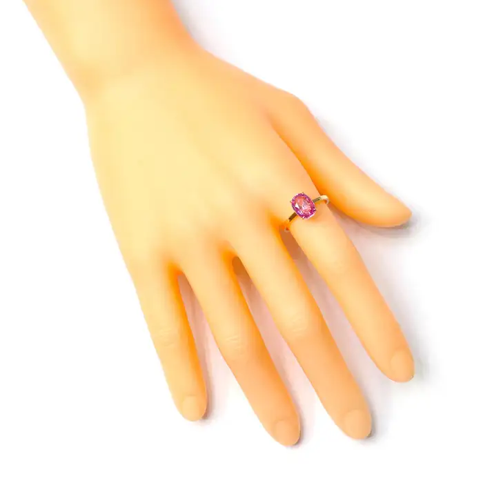 A beautiful 14K solid gold ring featuring an oval-cut pink sapphire in a prong setting, offering an elegant and timeless design perfect for any occasion.
