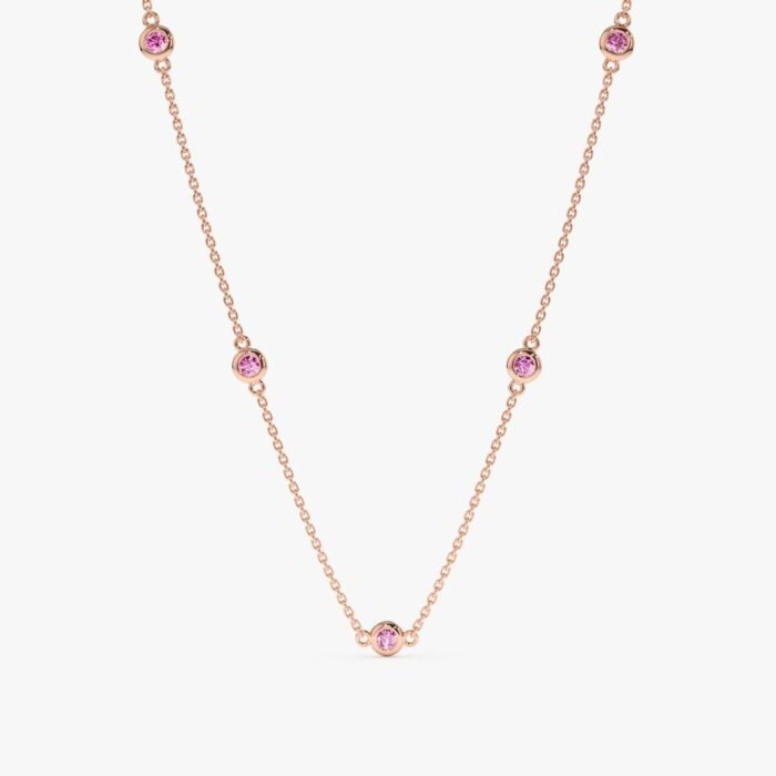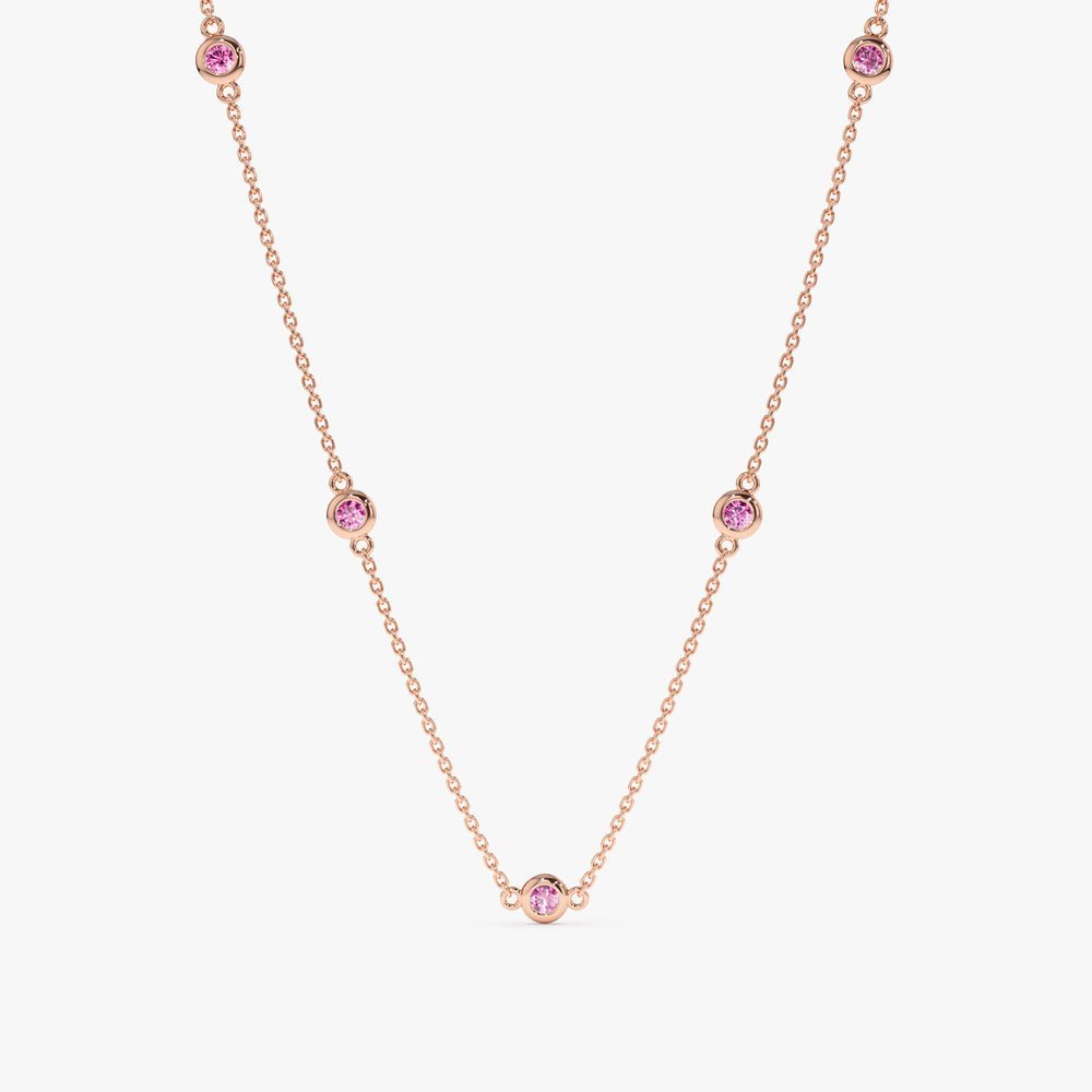 A delicate 14K solid gold necklace featuring vibrant pink sapphire stations, offering a timeless and elegant design perfect for any occasion.