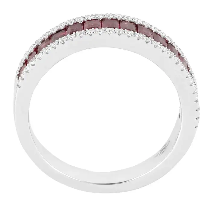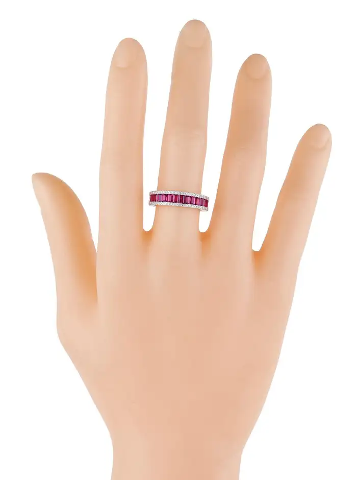 14K Solid Gold Ruby Half Eternity Ring . Made in 14KÂ gold, this stunning ring features a fantastic display of vibrant rubies and sparkling diamonds that gracefully symbolize endless love and commitment. The rich red color of the rubies, weighing 1.66 carats, is beautifully complemented by 0.23 carats of dazzling diamonds, creating a captivating contrast that will definitely catch the eye.
