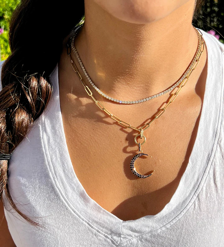 A beautiful 14K solid gold crescent moon pendant featuring vibrant sapphires, offering a celestial and elegant design perfect for any occasion.