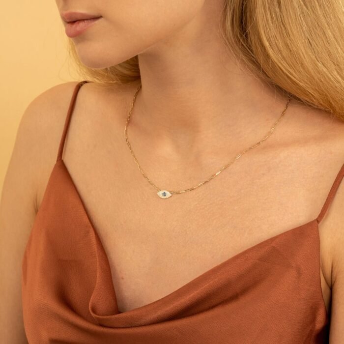 Protective 14K solid gold necklace featuring a symbolic evil eye pendant—crafted for modern charm, meaningful style, and everyday elegance.
