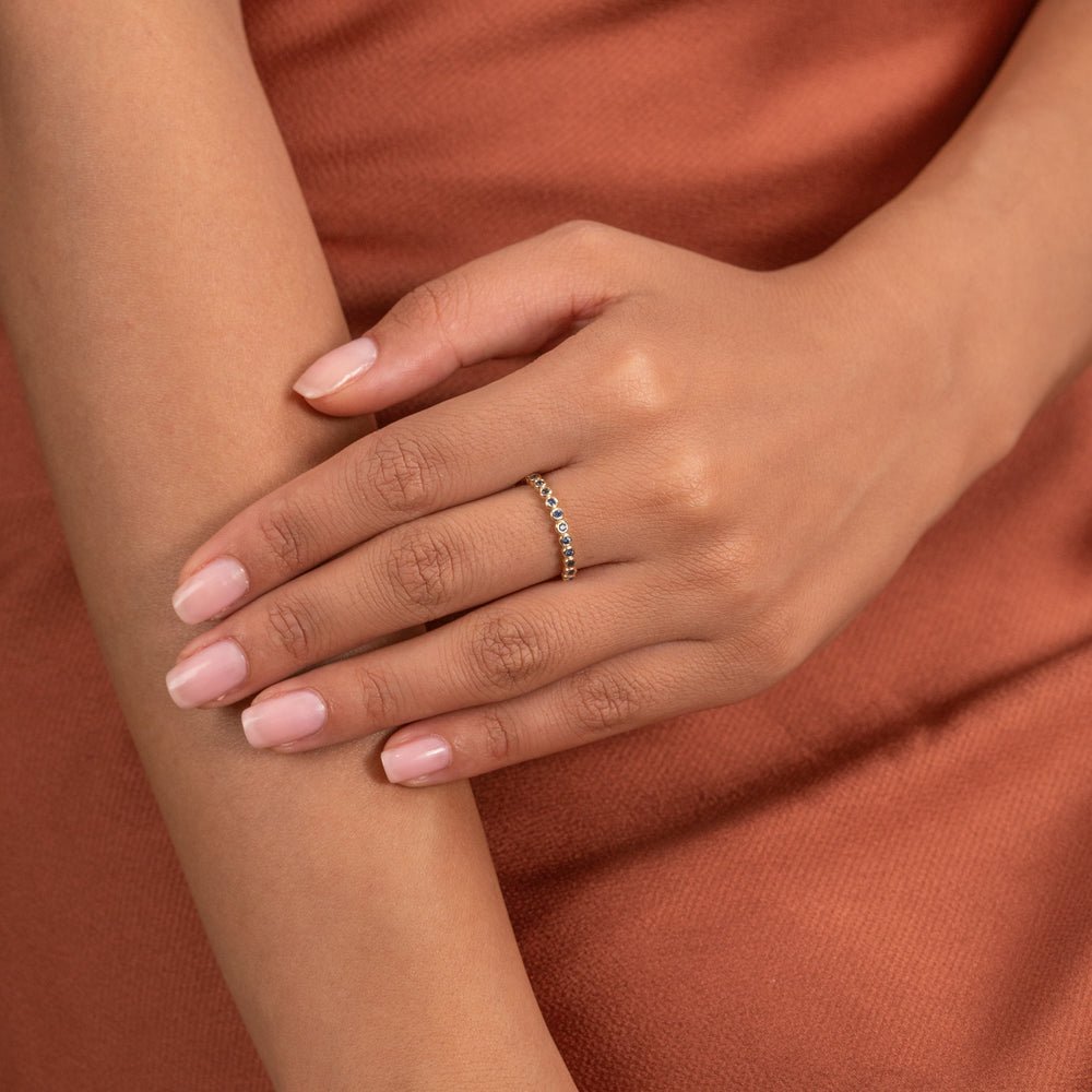 Elevate your ring stack to new heights of glamour with our Sapphire Half Eternity Band, a timeless and sophisticated accessory designed to add a touch of luxury to any ensemble. Meticulously handcrafted from solid gold, this exquisite band features a row of natural blue sapphires that exude elegance and charm.