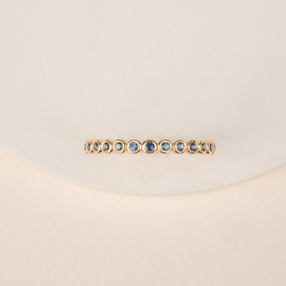 Each sapphire is securely bezel-set in solid 14k or 18k gold, ensuring both durability and timeless elegance. Its classic half eternity design symbolizes everlasting love and commitment, making it a meaningful and sentimental piece of jewelry.