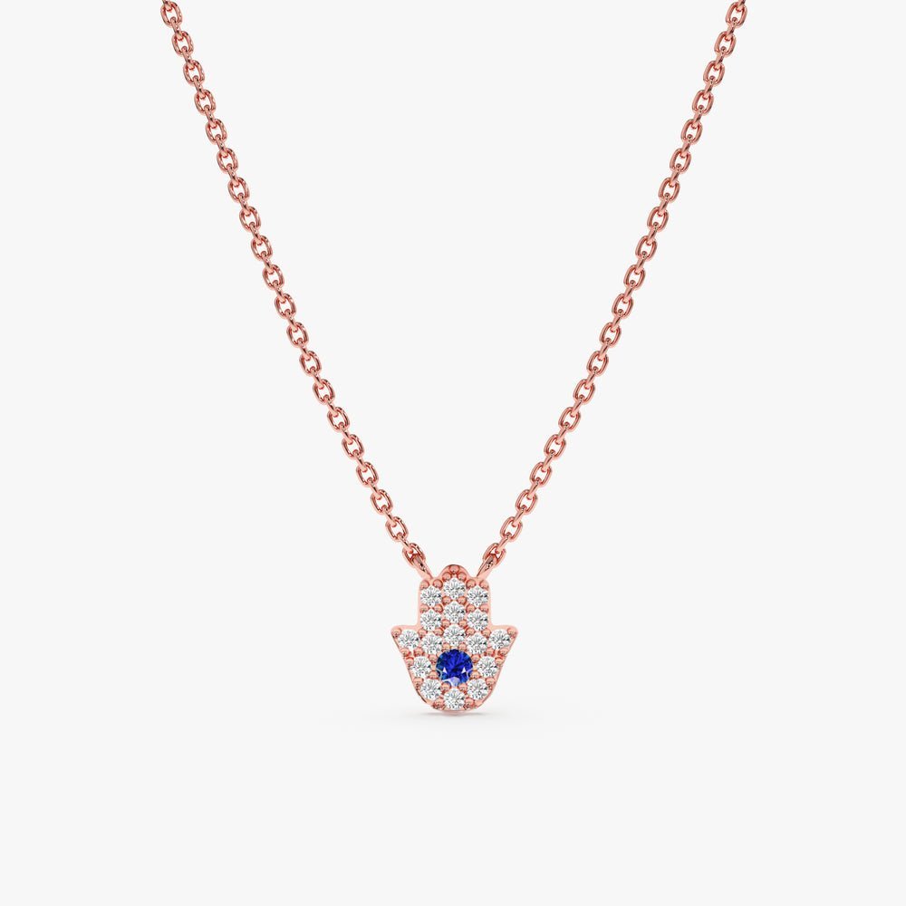 Surrounding the sapphire and adorning the fingers of the Hamsa are sparkling diamonds, each meticulously set to enhance the charm’s brilliance. These natural diamonds, graded G color and SI Clarity, boast a total carat weight of 0.09 ctw, adding a mesmerizing sparkle and further elevating the necklace’s allure.