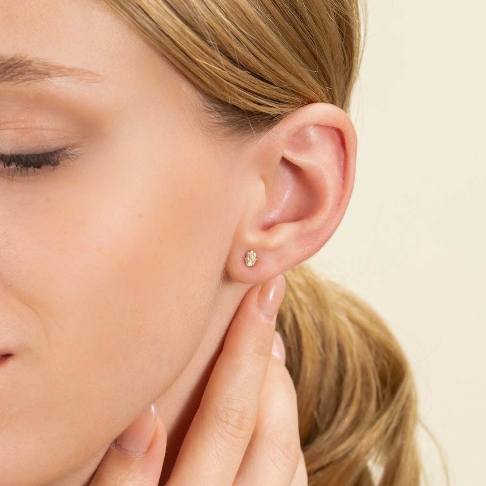 A meaningful single hamsa stud in 18K solid gold, finished with a subtle natural diamond sparkle—perfect for everyday protection-inspired style.