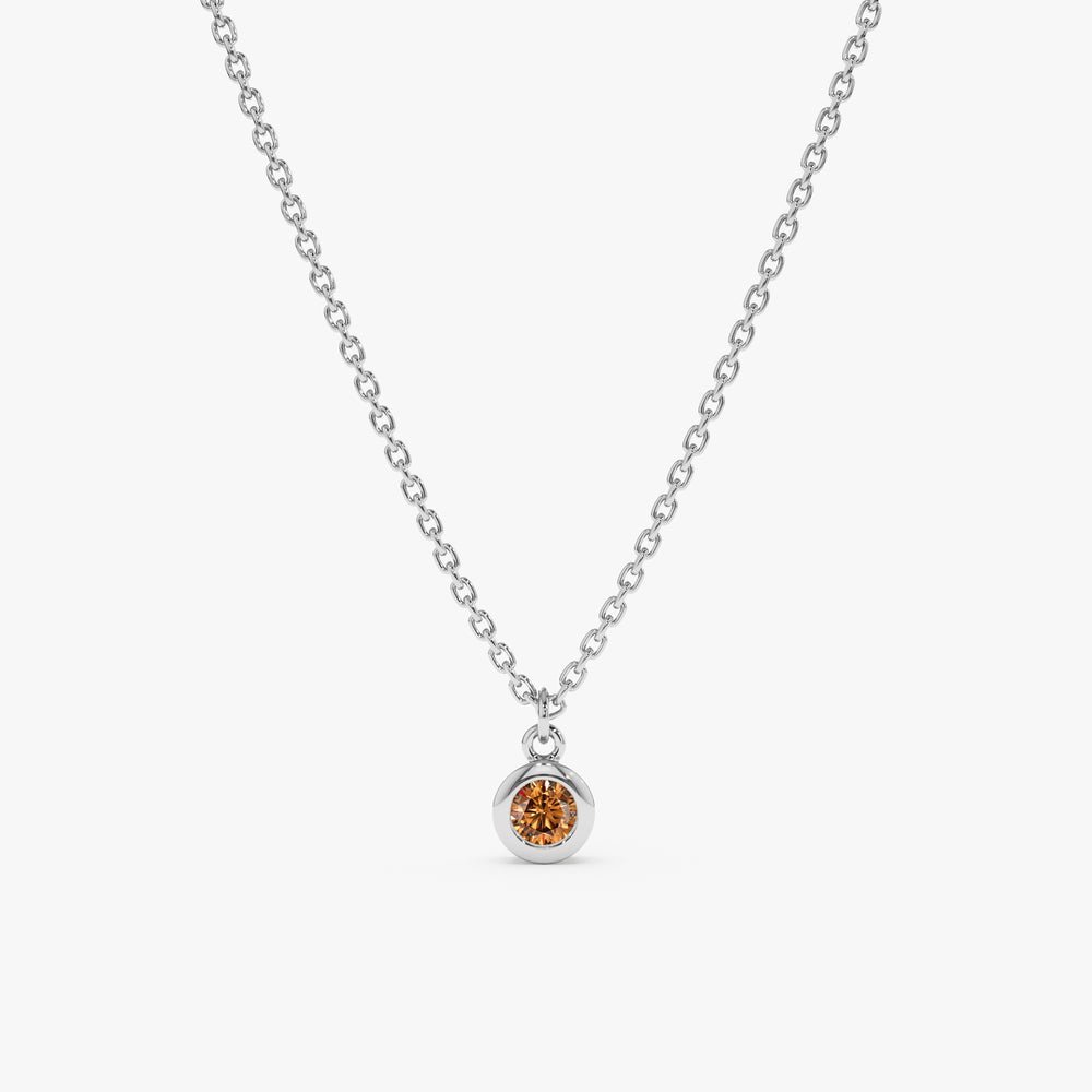 At the heart of the necklace lies a stunning citrine gemstone, hand-cut and polished to perfection. Known for its radiant yellow hue reminiscent of a sunlit day, citrine exudes warmth and positivity, making it a symbol of joy and abundance. The gemstone is securely held in place by a sleek bezel setting crafted from solid 14k gold, available in yellow, rose, or white gold options. This minimalist setting allows the citrine to take center stage, showcasing its natural brilliance and vibrant color.