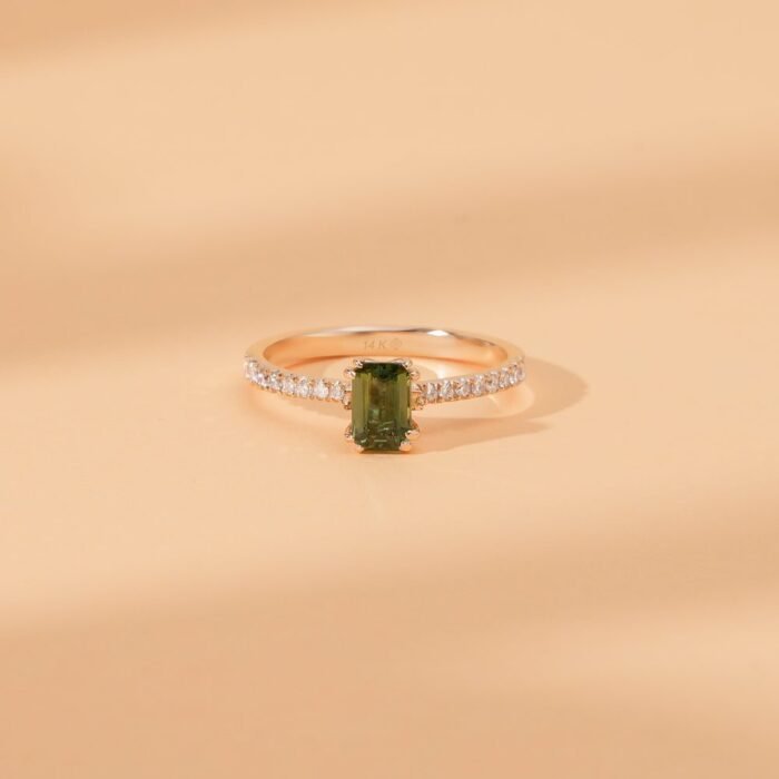 Stunning 14K solid gold diamond and octagon cut emerald ring, featuring a bold octagon-shaped emerald center stone accented with sparkling diamonds for a sophisticated look.