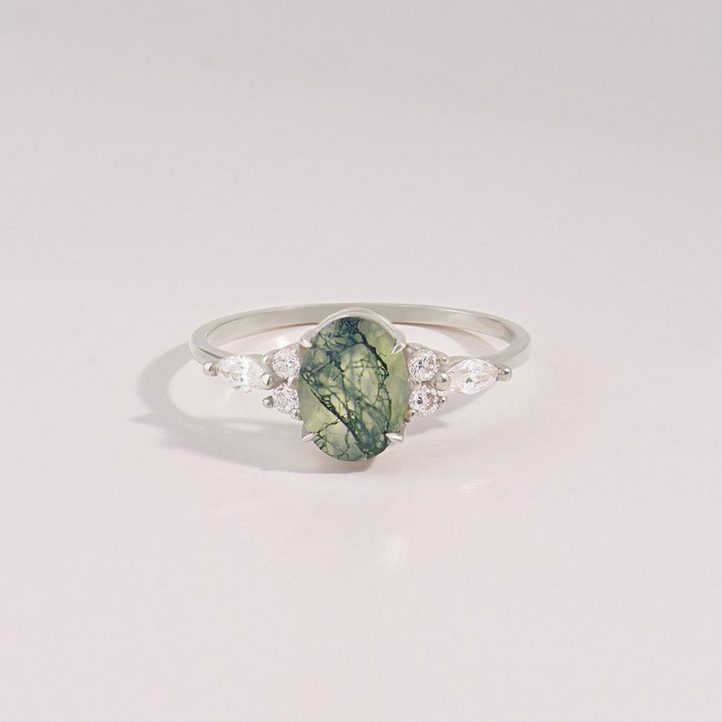 The moss agate is beautifully complemented by a halo or side accents of natural diamonds, adding a touch of classic elegance and sparkle to the ring. These diamonds are carefully selected for their brilliance and clarity, providing a dazzling contrast to the earthy tones of the moss agate. The combination of the serene moss agate and the radiant diamonds creates a harmonious balance between nature and luxury, making this ring a symbol of both uniqueness and timeless beauty.