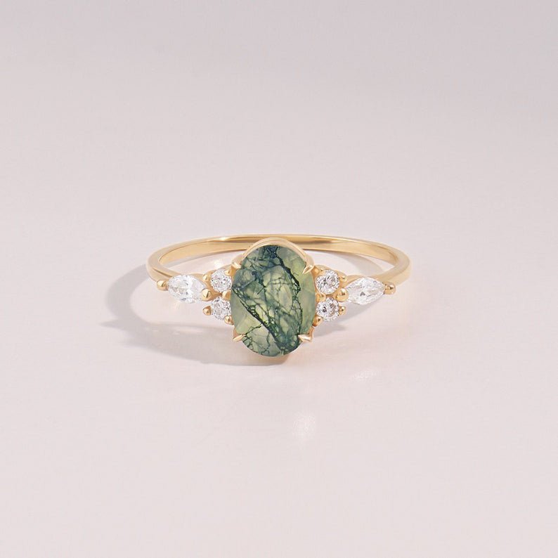 14K Solid Gold Moss Agate Engagement Ring is a striking blend of natural beauty and sophisticated design, making it a perfect choice for an engagement ring that stands out from the rest. At the heart of this exquisite ring is a stunning moss agate gemstone, renowned for its unique, nature-inspired patterns that resemble lush landscapes. Each moss agate stone is truly one-of-a-kind, featuring intricate inclusions that give the stone its distinct character and organic charm.