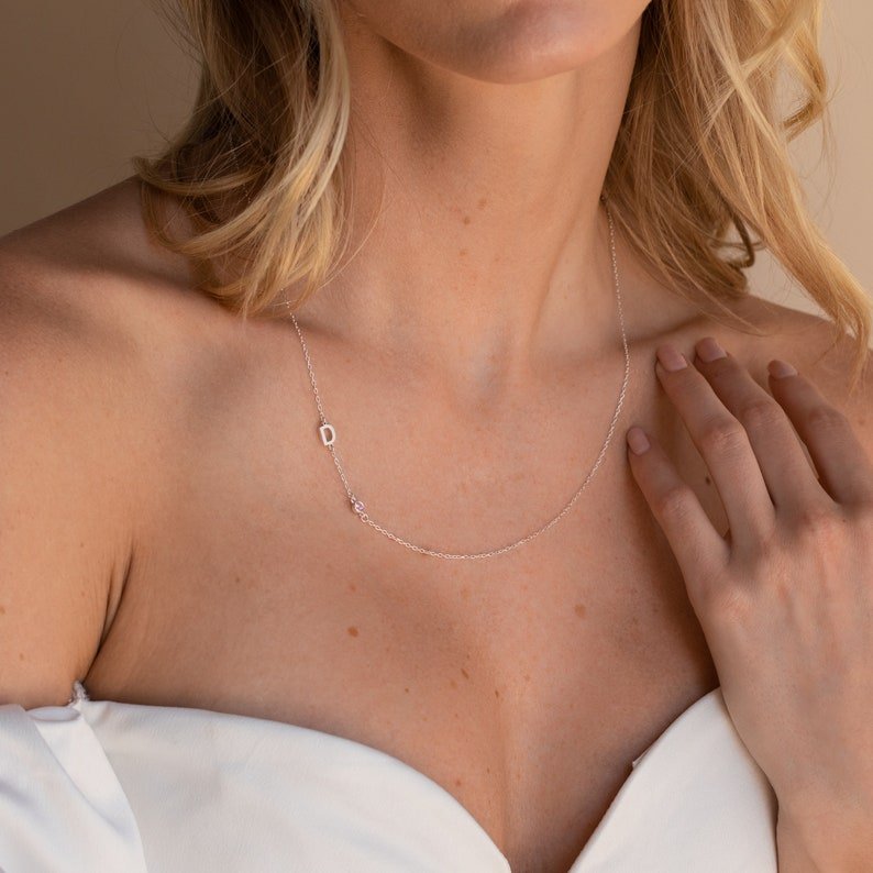 The sideways initial is crafted with precision, showcasing a clean, minimalist design that allows the letter to shine with understated elegance. Each letter is adorned with high-quality materials, ensuring a polished and refined appearance. The birthstone, chosen to represent the recipient’s birth month or a significant date, adds a touch of color and personalization to the design.