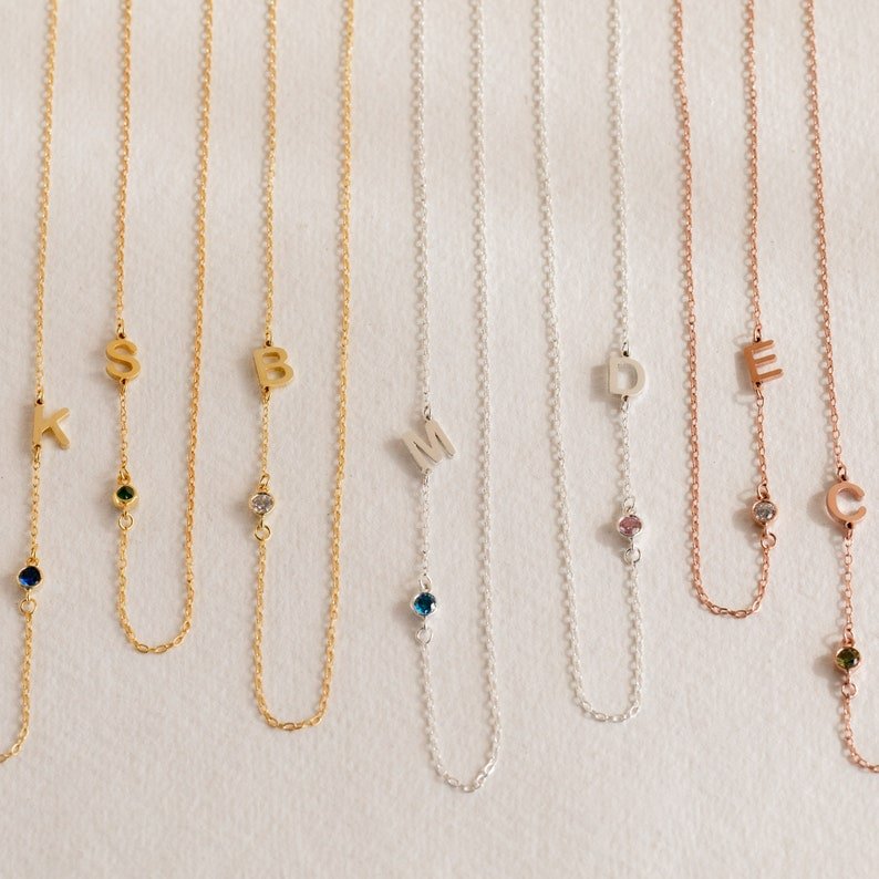 The Karat Store Sideways Initial Birthstone Necklace | Dainty Gemstone Letter Necklace| Personalized Birthday Gifts