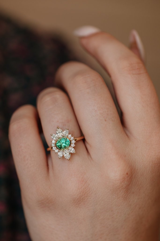 Introducing The Ray Oval Emerald Ring, a beautiful piece of fine jewelry set in luxurious 14K solid gold. This stunning ring features a vibrant.89-carat Colombian emerald, which is known for its deep green color and excellent clarity.