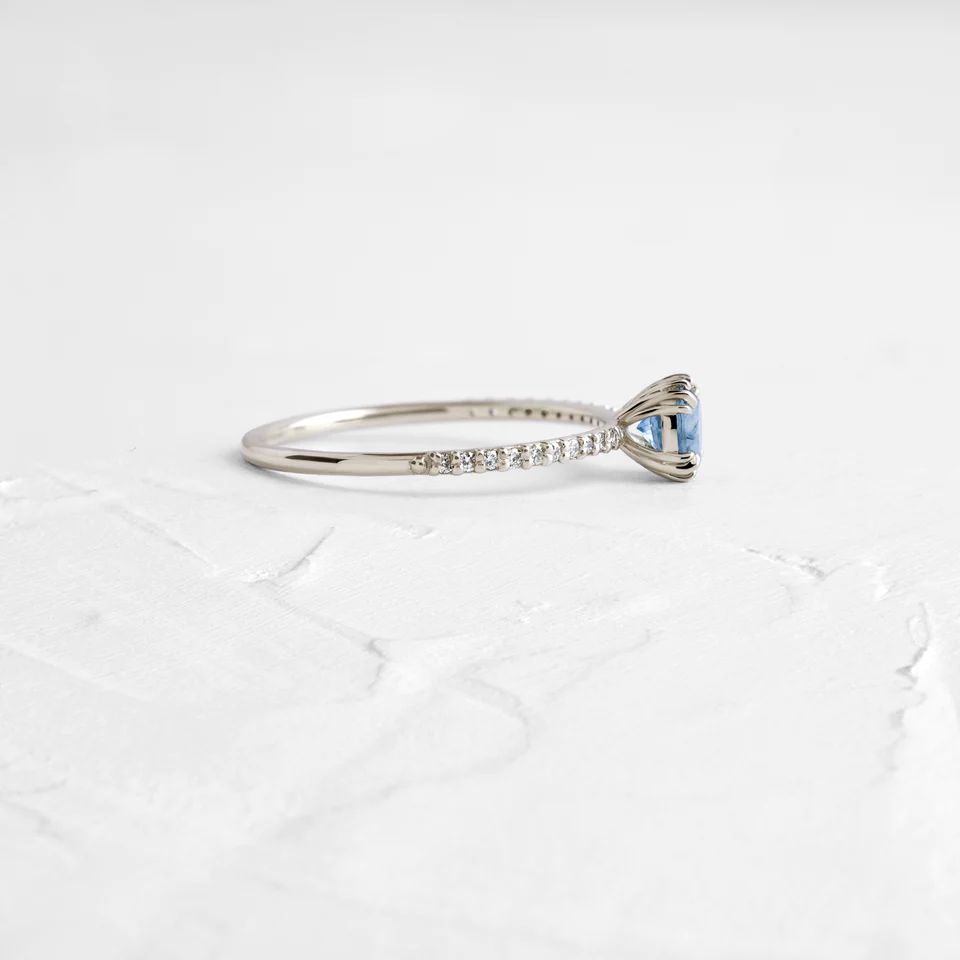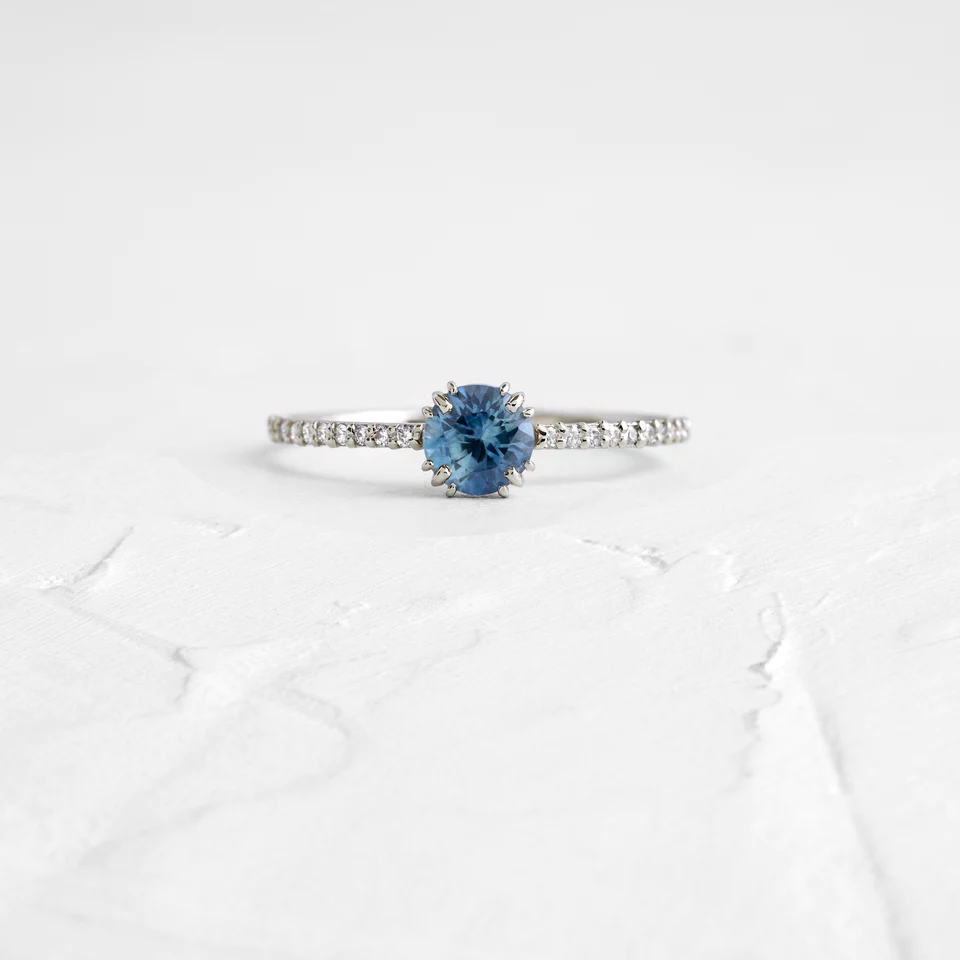 14K Solid Gold Threaded Ring with Pave Band, 0.65ct. Greenish Blue Sapphire Ring