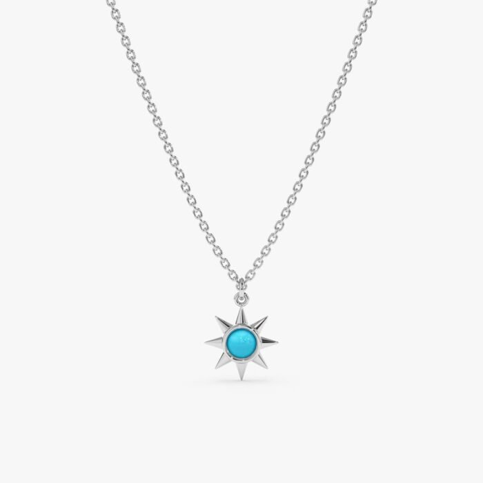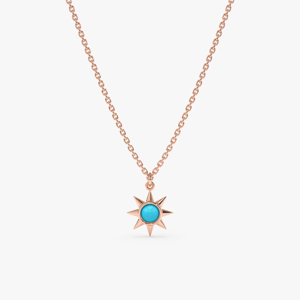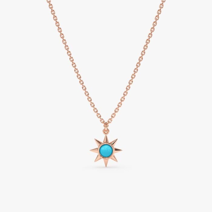 Our Turquoise Sun Necklace features a radiant sun pendant crafted from solid 14k gold, with a stunning natural turquoise gemstone centerpiece.