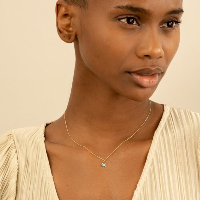 At the heart of the pendant lies a stunning natural turquoise gemstone, celebrated for its refreshing hue and spiritual significance. Measuring 7 mm in diameter, the sun pendant exudes a radiant glow, symbolizing vitality, energy, and the eternal cycle of life. Surrounding the turquoise gemstone is a delicate bezel setting crafted from solid gold, with each bezel measuring 3 mm in size. This adds a subtle touch of contrast and enhances the natural beauty of the turquoise.