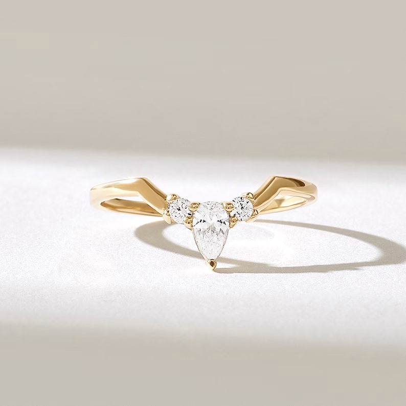 14K gold deep V-shaped pave ring with 0.19 ct natural diamonds of GH color, VS-SI clarity. Stackable nesting band. GIA & BIS Certified.